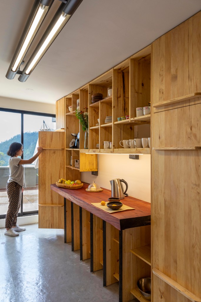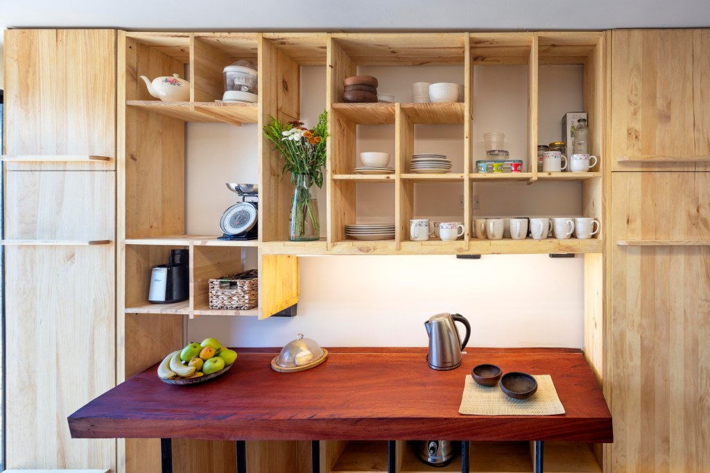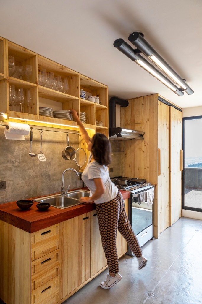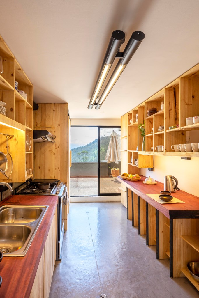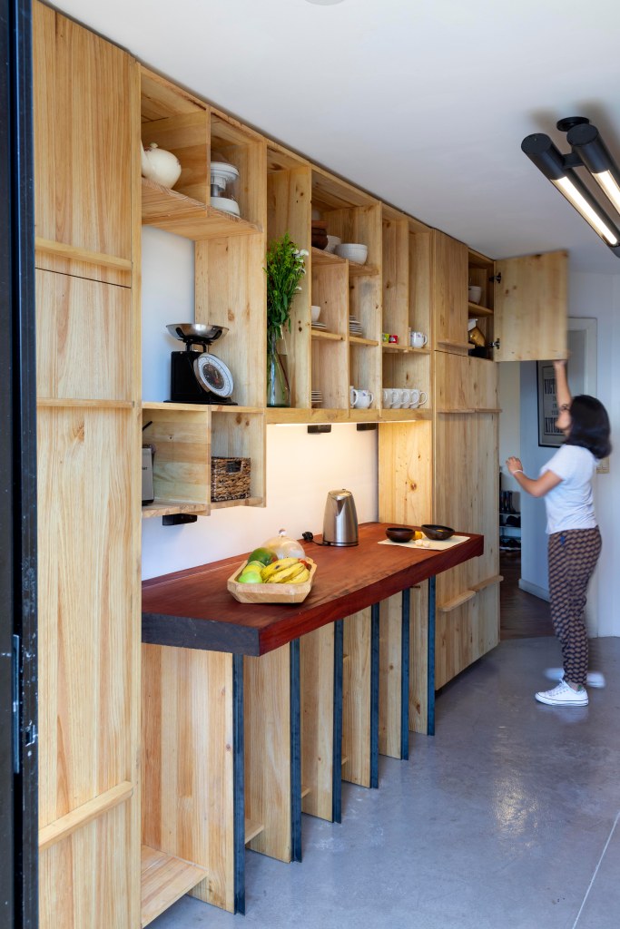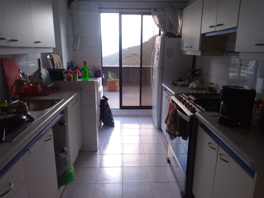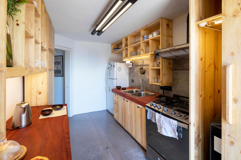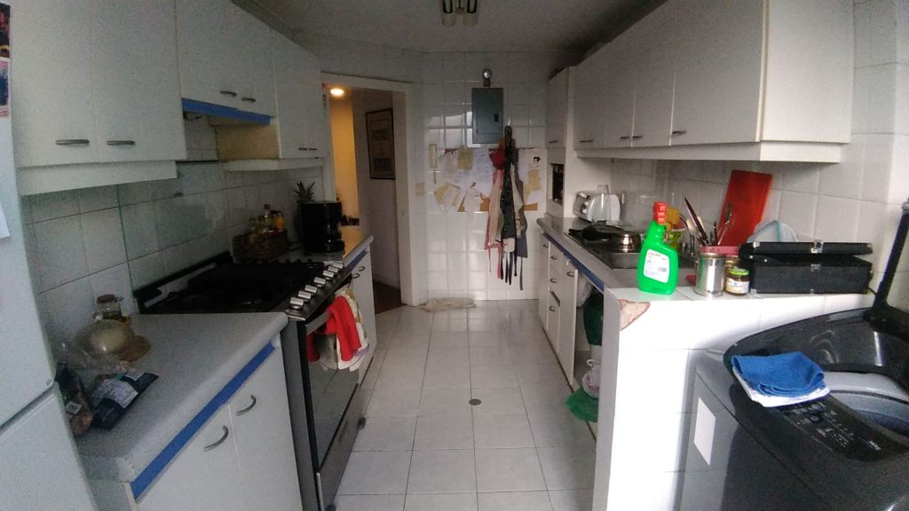 La cocina ocupa un espacio rectangular de 4,65 metros de largo por un ancho variable que en promedio rondaba los 2,60 metros, en un inicio contaba con mobiliario inferior y superior sobre los laterales largos, y en los cortos se ubicaba por un lado el ingreso desde el departamento, y, por el otro una puerta/ventana de vidrio corrediza que abre hacia la terraza y al gran paisaje, la refrigeradora se ubicaba a un lado de la ventana cubriendo casi todo el paso de luz y la vista.