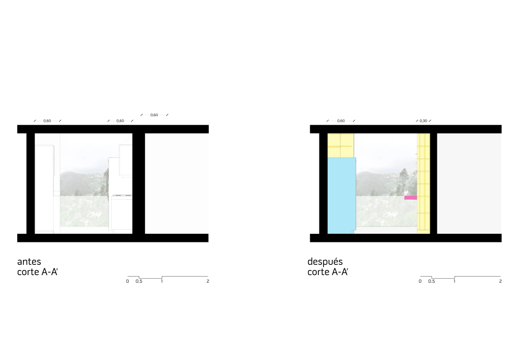 Para ganar espacio, permitir un mayor ingreso de luz y potenciar el acceso a las visuales, redujimos el ancho de uno de los muebles laterales de 60 a 30 centímetros, concentrando aquí el almacenaje de vajilla y alimentos; para esto, ampliamos el área útil de los muebles ocupando la altura total del espacio, mantuvimos un mesón de trabajo de 60 centímetros proyectado por fuera del mueble y adicionamos un espacio de escobero en un extremo.