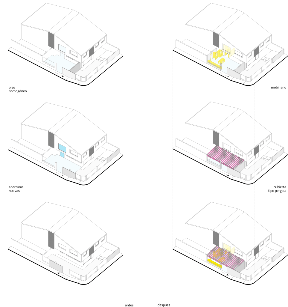 Al ser una casa esquinera -adosada en sus dos fachadas posteriores- se genera un retiro sobre la esquina de 5 metros. Destinado hacia un lado, para accesos vehiculares, peatonales y espacios de uso cotidiano de la casa ,y, hacia el otro, un acceso secundario con espacio para parquear dos carros, el estudio y en la segunda planta las dos habitaciones de los hijos.