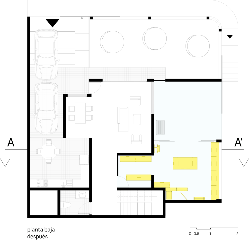 Para la intervención decidimos ocupar este último acceso, aprovechando los dos parqueos, un pedazo del jardín anexo a estos, el estudio y una de las habitaciones del segundo piso. La tienda se distribuye en el antiguo estudio conectado al jardín, un parqueadero se mantiene como un espacio complementario para ampliar la tienda eventualmente a manera de feria. Aprovechamos la puerta existente para el acceso a la tienda, cambiando el sentido de apertura de la misma para permitir que la tienda tenga una vitrina de exhibición hacia la vereda. En la habitación de la planta alta ubicamos un espacio de bodega y otra vitrina de exhibición generando visuales hacia la calle.
