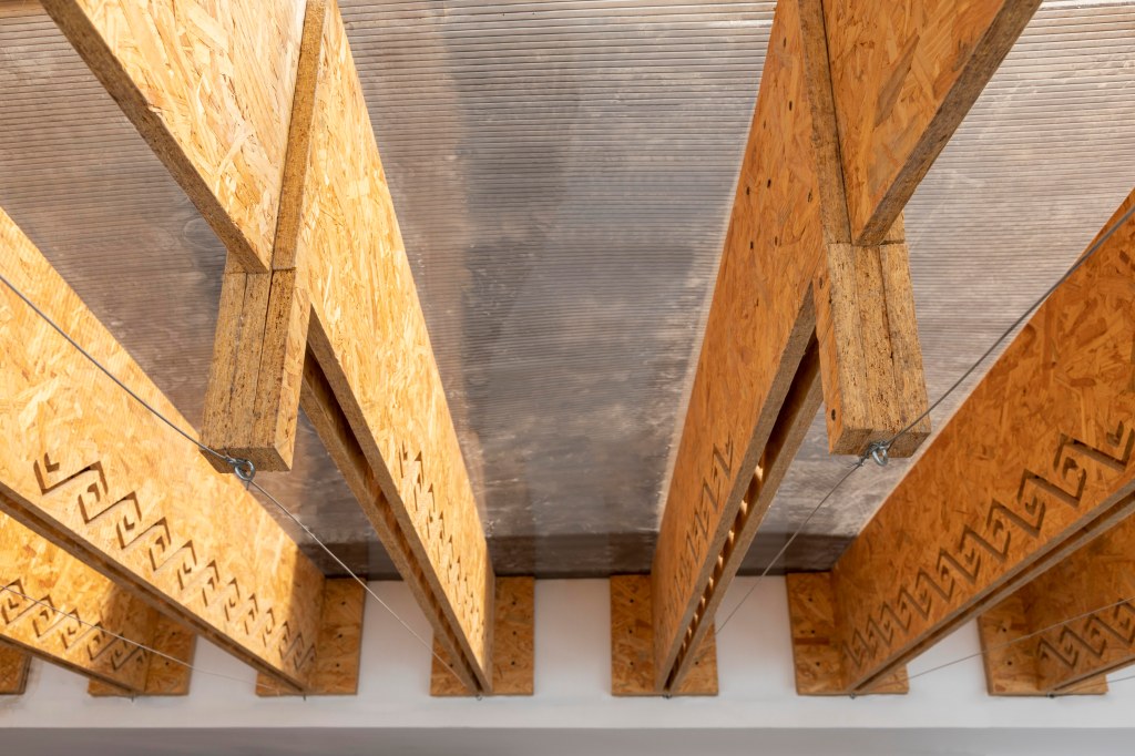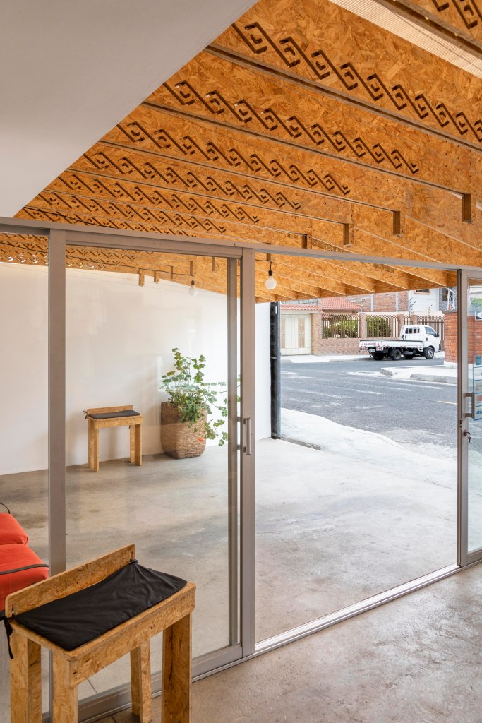 Con la cubierta ocupamos los retiros del frente de la casa así que, por normativa, solo podíamos pensar en una cubierta ligera tipo pérgola. El espacio a cubrir tiene una luz de 4,75 metros y el OSB viene en un formato de 1,22 x 2,44 metros. Para esto diseñamos una viga compuesta, reforzada con elementos inferiores a tensión que nos permiten trabajar con piezas de un largo máximo de 2,44 metros, de esta manera, generamos un solo elemento que cubre la luz total. Las piezas para configurar estas vigas se fabrican con corte computarizado y se construyen en serie previo al montaje. El corte computarizado nos permite incluir elementos relacionados a la marca de la tienda, cortes con los patrones utilizados en el logo de Palla, aportando personalidad al espacio.