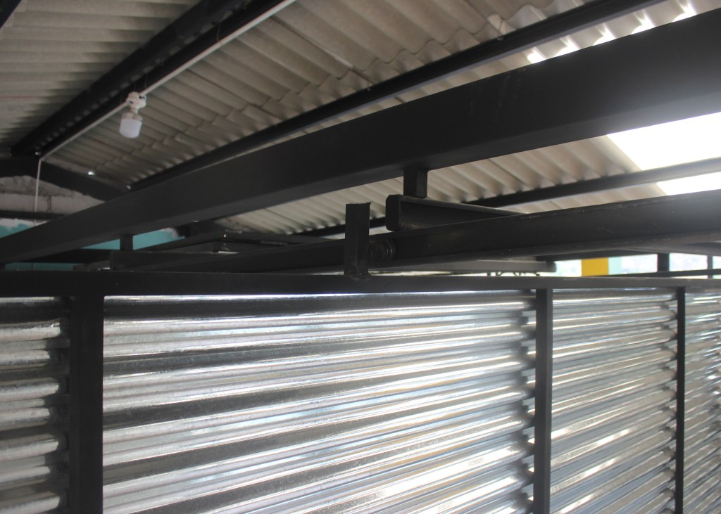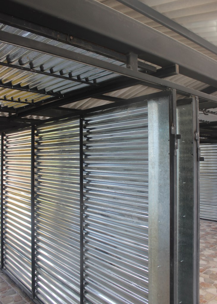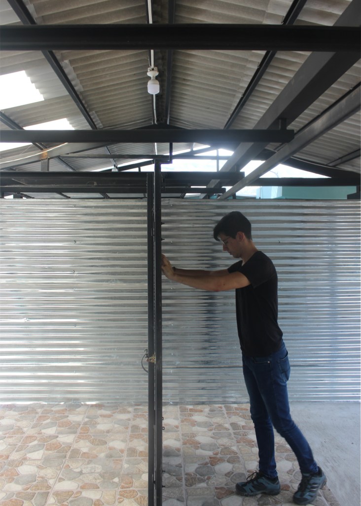 Materialmente el Albergue Transitorio Humanx se resuelve en perfiles de acero que soportan las divisiones de planchas de zinc que responden al uso de alto tránsito y durabilidad requerida. De igual forma, se utilizan herrajes industriales que facilitan la configuración del espacio acorde a las necesidades de cada día, pudiendo ser manipulado rápidamente por un grupo de 2 personas.