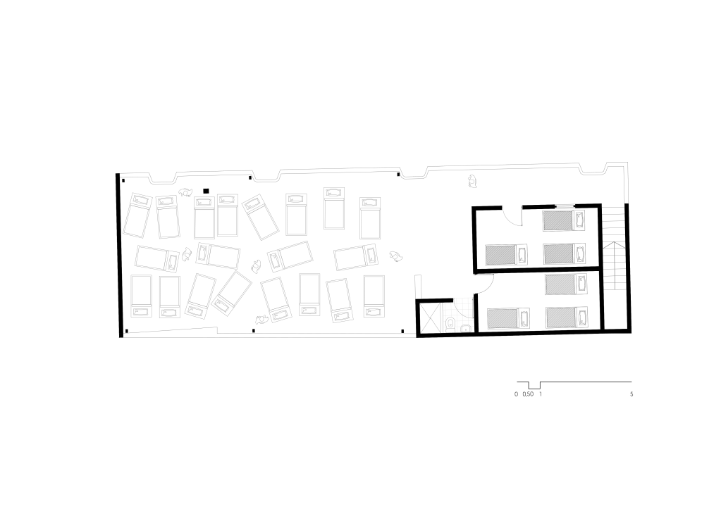 El proyecto busca mejorar las condiciones de confort del espacio más grande, donde sólo dormían los caminantes hombres y plantea un sistema de subdivisión versátil que pueda adaptarse a las necesidades de cada grupo que llegue buscando la equidad de género. El mecanismo aplicado en el espacio de mayor superficie se compone por paredes móviles y puertas levadizas que permiten una división máxima en 5 espacios y a su vez espacios dobles, triples, cuádruples o completos para albergar a los distintos grupos que llegan o nuevas actividades que puedan darse en otros momentos.