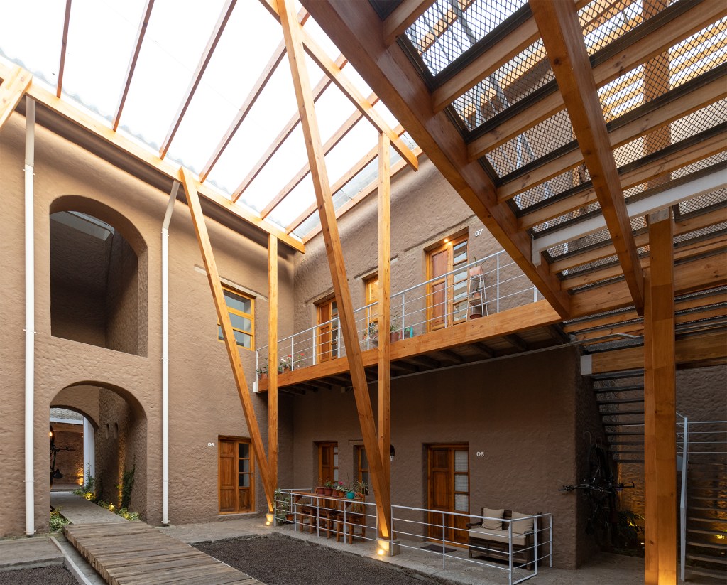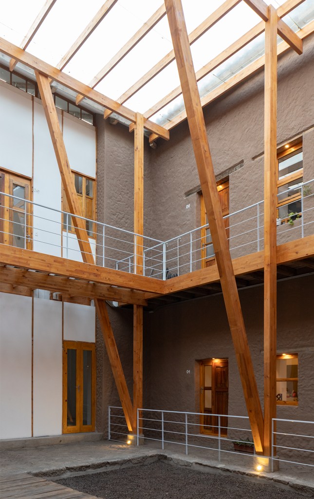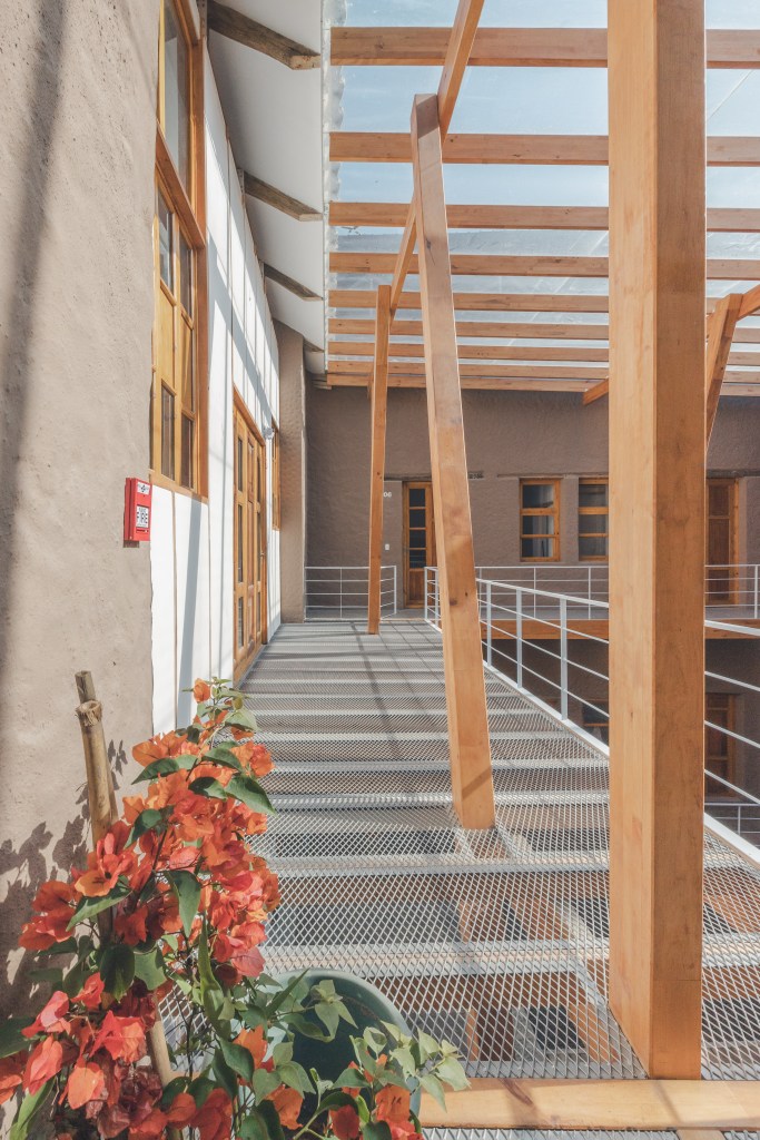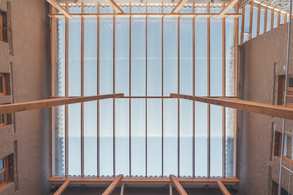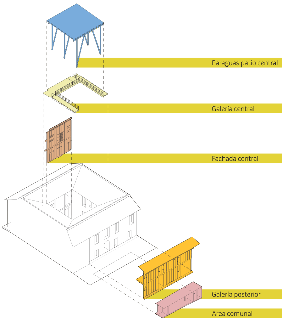 La apuesta se enfoca en los espacios de ocupación colectiva, el patio central se protege mediante un gran paraguas resuelto con pórticos de madera laminada y techo de vidrio para aportar mayor iluminación y calor al interior de las viviendas. Se suman a esta acción, pequeñas intervenciones en la construcción original, que aportan a estas dos búsquedas (luz y calor); la cubierta de teja que cubría los pasillos del patio central se retrae hasta el borde de los muros, ampliando la superficie de cielo; los pasillos perimetrales al patio, que originalmente eran de 1,80 metros, pasan a tener 1,20 metros de ancho; se elimina uno de los corredores para que aparezcan dos pasillos laterales de uso privado y el corredor de acceso comunal y las escaleras principales se fabrican en planchas de acero perforado que permiten el paso de la luz.