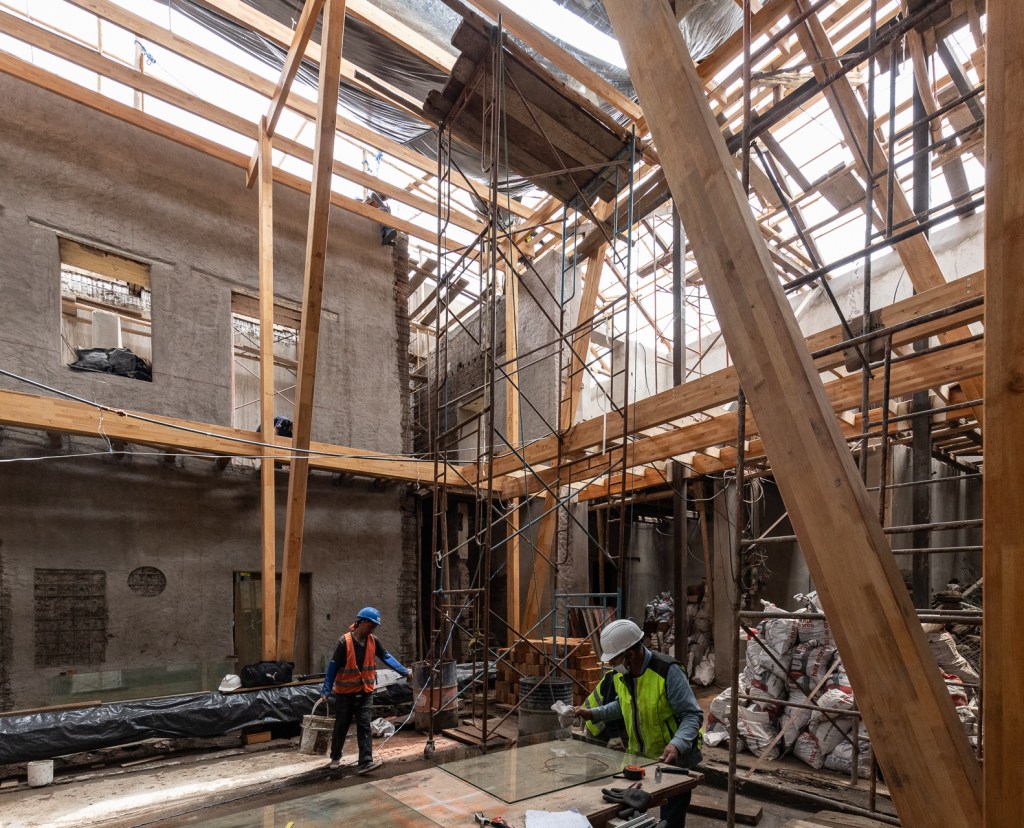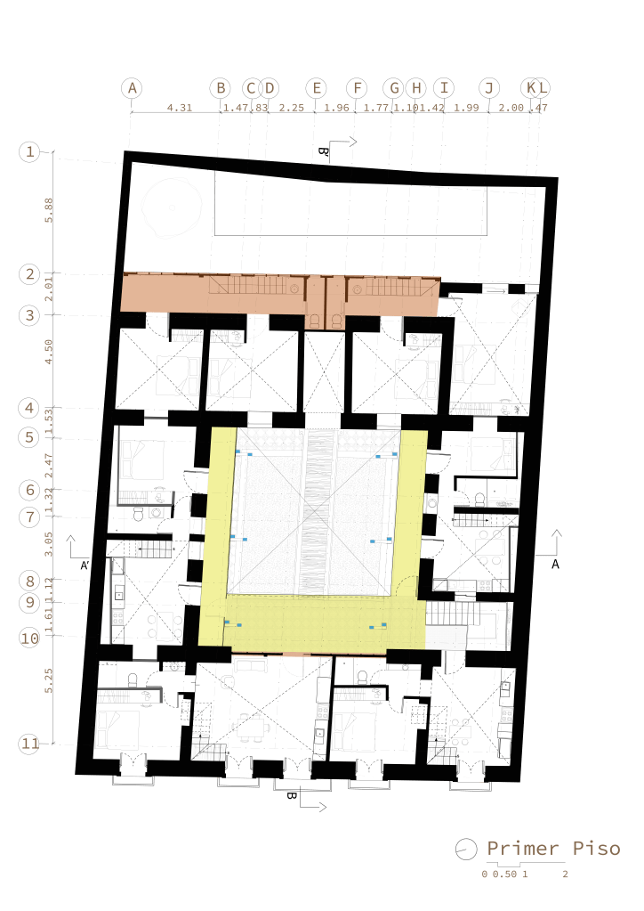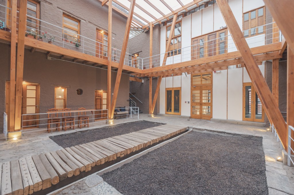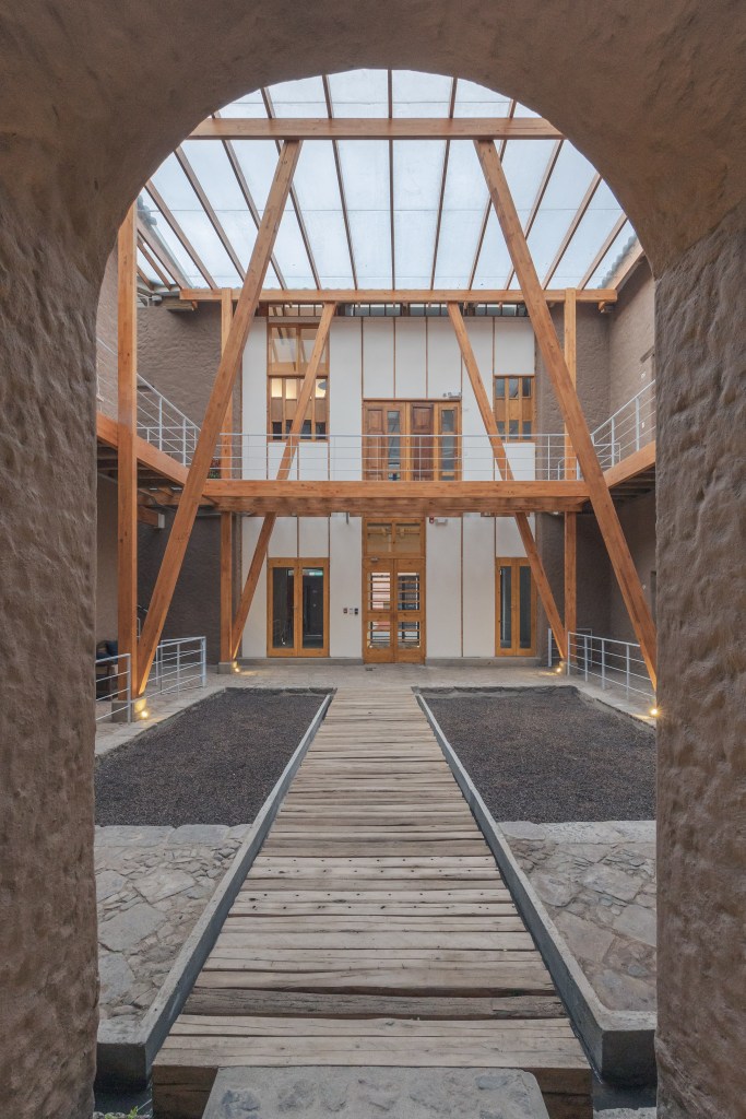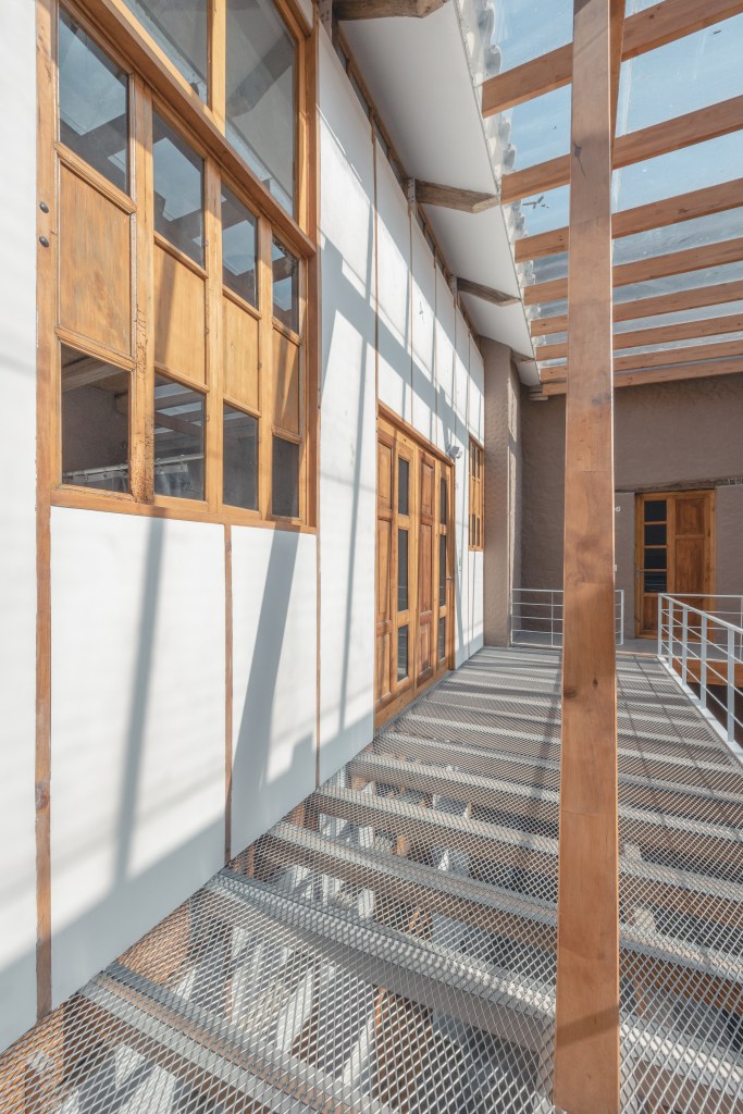 La apuesta se enfoca en los espacios de ocupación colectiva, el patio central se protege mediante un gran paraguas resuelto con pórticos de madera laminada y techo de vidrio para aportar mayor iluminación y calor al interior de las viviendas. Se suman a esta acción, pequeñas intervenciones en la construcción original, que aportan a estas dos búsquedas (luz y calor); la cubierta de teja que cubría los pasillos del patio central se retrae hasta el borde de los muros, ampliando la superficie de cielo; los pasillos perimetrales al patio, que originalmente eran de 1,80 metros, pasan a tener 1,20 metros de ancho; se elimina uno de los corredores para que aparezcan dos pasillos laterales de uso privado y el corredor de acceso comunal y las escaleras principales se fabrican en planchas de acero perforado que permiten el paso de la luz.