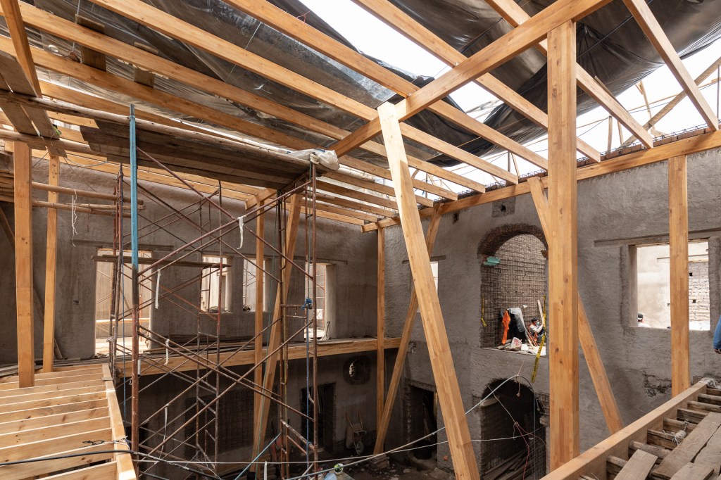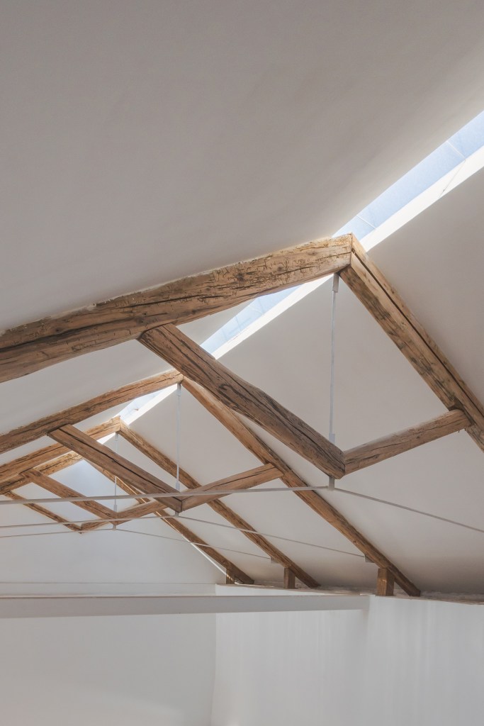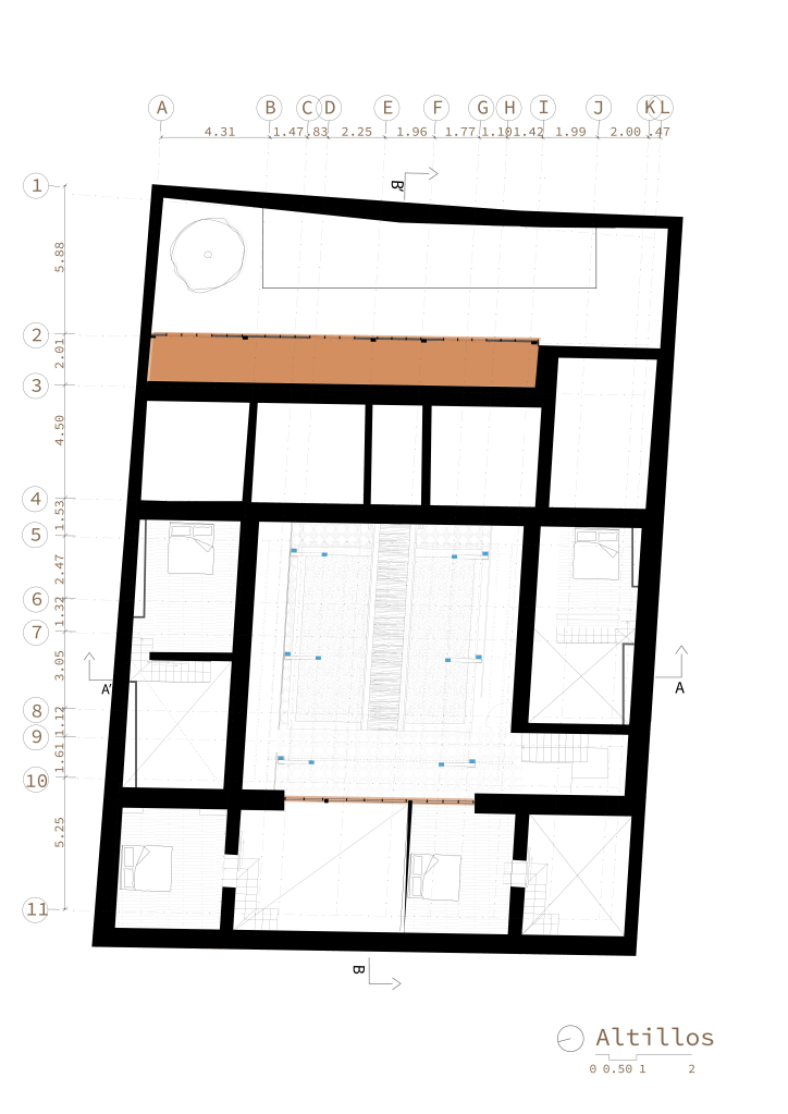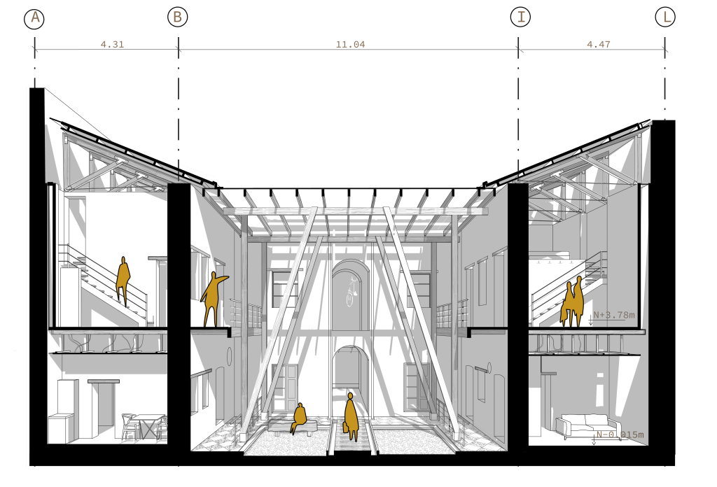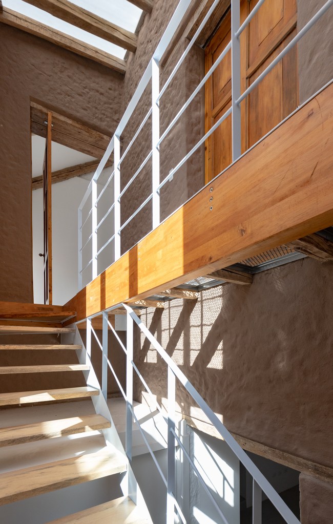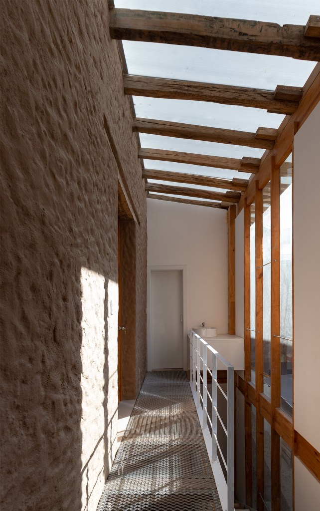 The project focuses on the spaces of collective occupation, the central courtyard is protected by a large umbrella with a laminated timber structure and a glass roof to provide more light and warmth to the interior of the homes. In addition to this action, small interventions in the original construction, which contribute to these two searches (light and heat); the tile roof that covered the corridors of the central courtyard is retracted to the edge of the walls, expanding the sky surface; The corridor around the perimeter of the courtyard, which were originally 1.80 meters wide, is now 1.20 meters wide; one of the sides of this corridor is eliminated to create two sides for private use and the communal access of it and the main stairs are made of perforated steel plates that allow light to pass through.