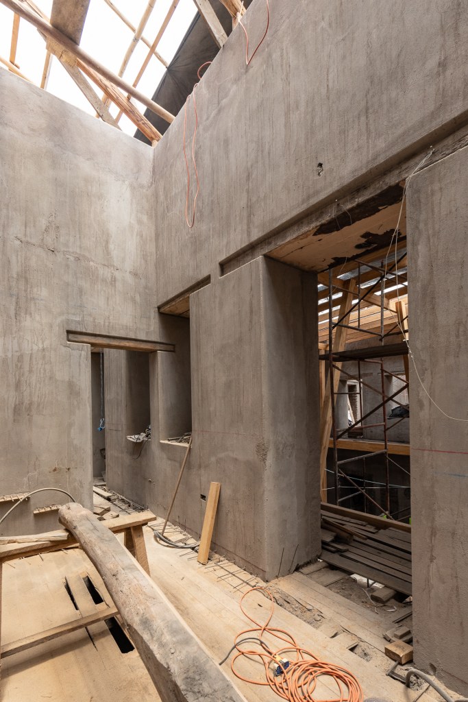 La propuesta arquitectónica consiste en recuperar y poner en valor la estructura original de la casa -muros de adobe portantes- mediante el refuerzo estructural desde la base de estos hasta su cabeza, así como también las cerchas originales de madera. El conjunto está compuesto por ocho departamentos y dos locales comerciales que se resuelven dentro de esta envolvente, con acabados sencillos lo que posibilita abaratar los costos de venta. Es así como el proyecto consigue generar una oferta de vivienda colectiva en el sector a precios accesibles y además ofrece unidades que funcionan como un lienzo en blanco para que los propietarios puedan dotar de mayor identidad al interior de sus viviendas.