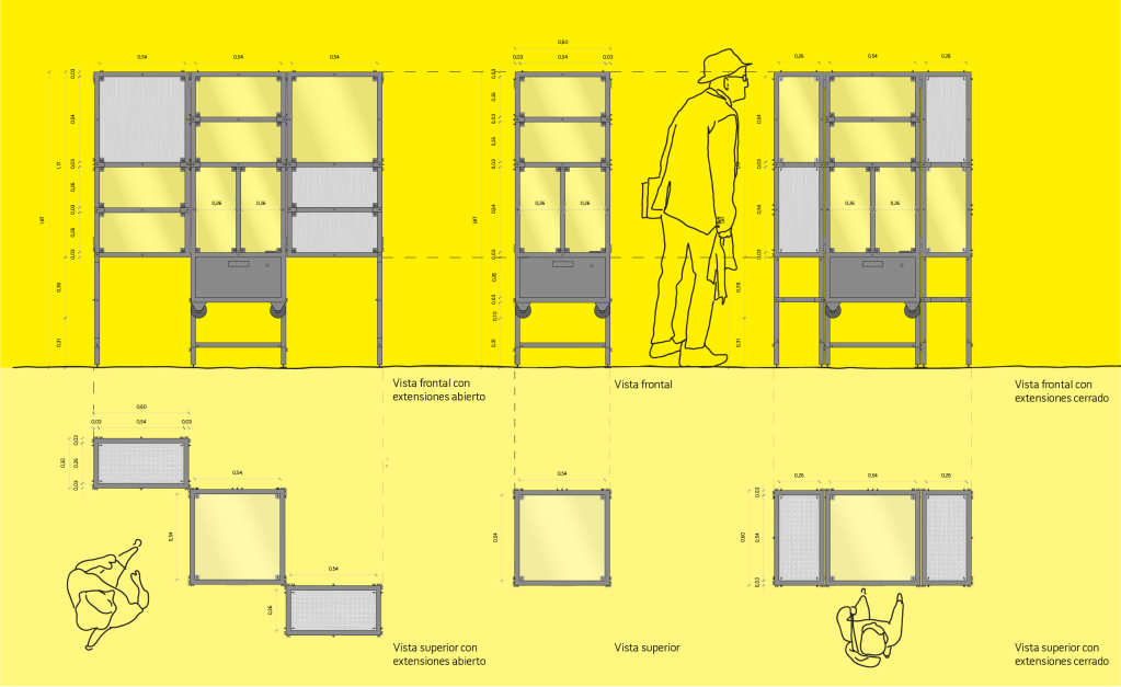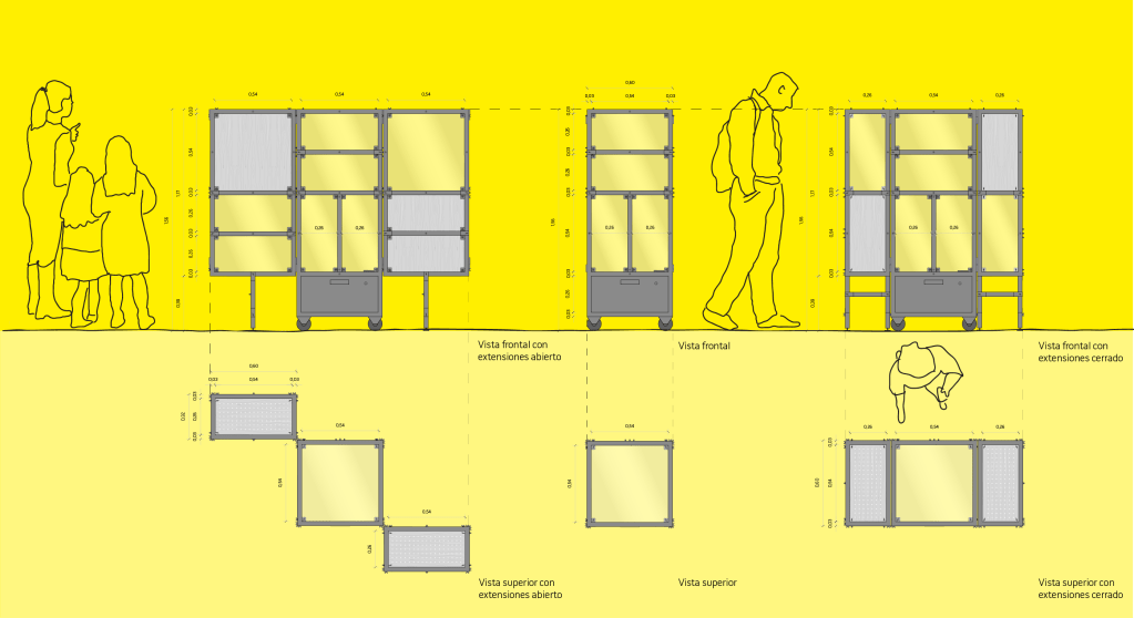 Se construyen cinco módulos idénticos que, se abren, se cierran, suben, bajan y tienen ruedas que les permite llegar a exponer en diversos lugares. Todas las piezas de cada módulo son intercambiables y pueden componer nuevas formas al juntarse. Los paneles de cierre, cuando son transparentes permiten ver el contenido al interior y cuando son sólidos, permiten generar espaldas de apoyo para los objetos que se exponen. Poseen conexión eléctrica para instalar reproductores de video o sonido, iluminación propia y superficies perforadas que permiten colgar elementos en su interior. Además, los soportes internos pueden ajustarse a diferentes alturas según los objetos que se deseen exponer.