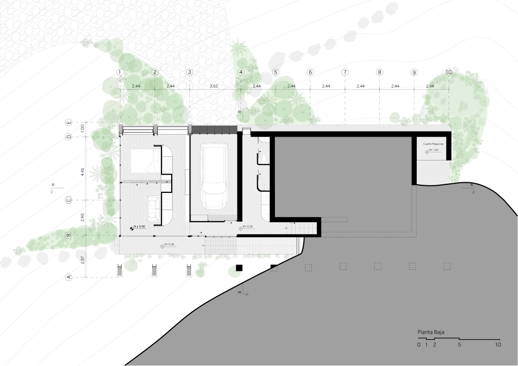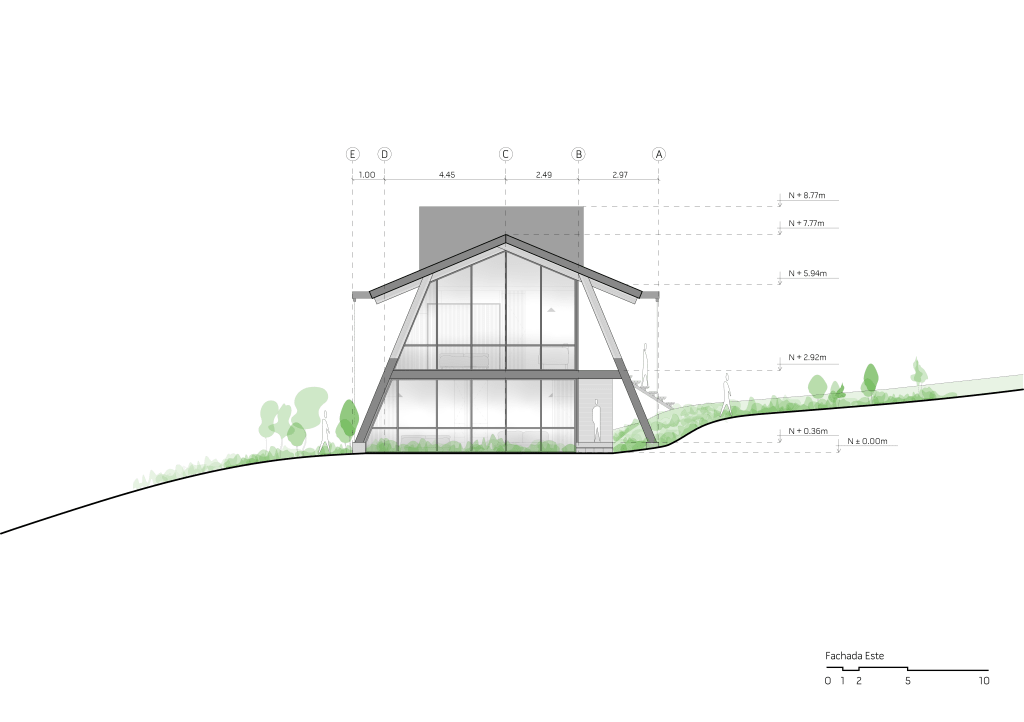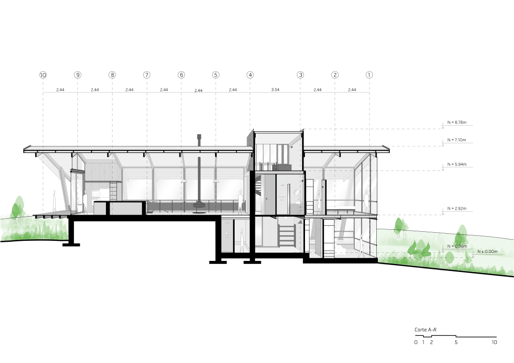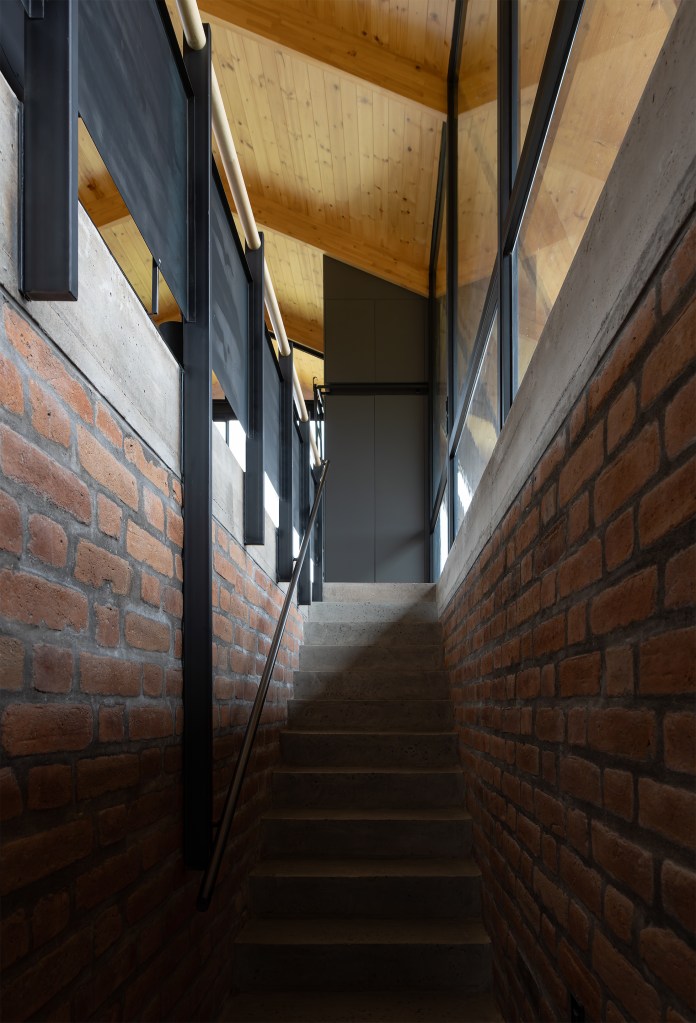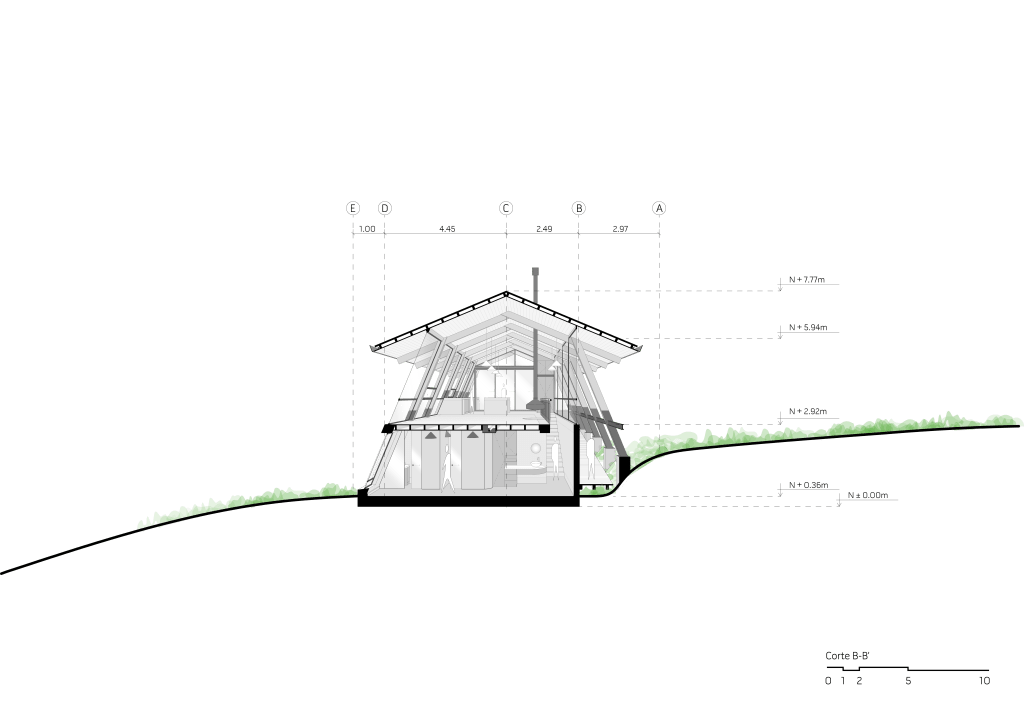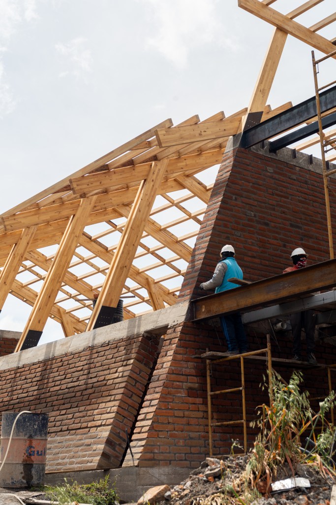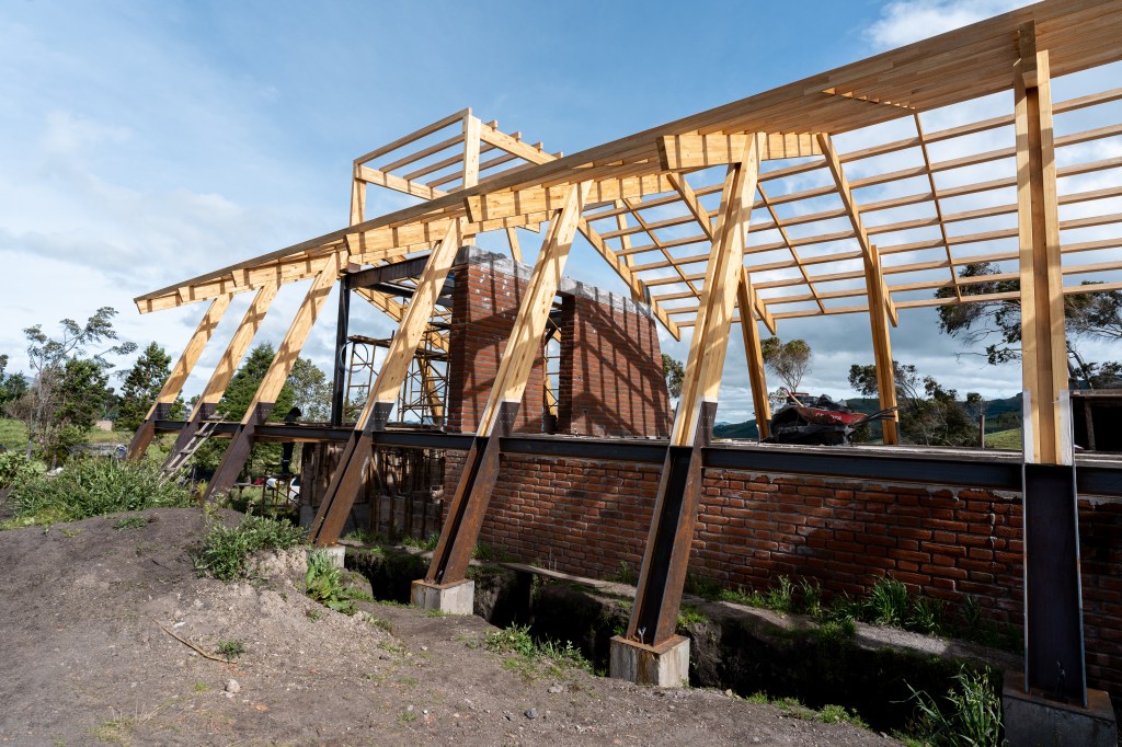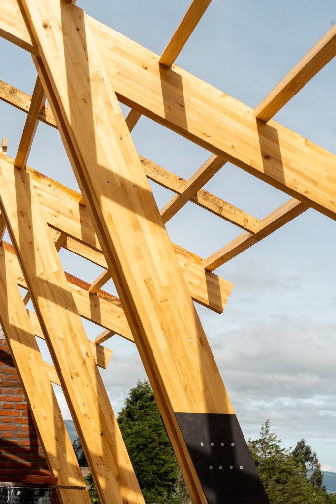 Ten wooden ribs support the house. The porticos are composed of four pieces with different inclinations that converge upward to provide greater shelter on the upper floor. On the north side, these porticos rest on a brick base that follows their inclination and disappears where the height allows for the lower floor. On the south side, where the ramp is located, the lower pieces of each rib vary in length to adapt to the slope of the ground. At the same time, they transition to metal to withstand rain and direct sunlight. The porticos are arranged every 2.44 meters and provide large eaves that protect the wood from rain and the interior from the sun. This pattern changes to support the loft and provide a wider view. The lower floors of this addition house the wet areas and the covered parking lot.