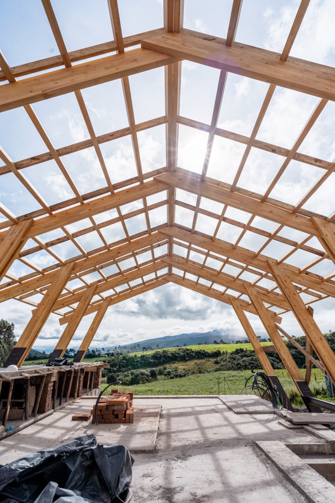 La vivienda se sostiene por diez costillas de madera, pórticos compuestos por 4 piezas con inclinaciones diferentes que buscan cerrarse hacia arriba, para generar mayor cobijo en la planta superior. Estos pórticos se asientan, en el costado norte, sobre un basamento de ladrillo que sigue su inclinación y desaparece cuando la altura permite la existencia del piso inferior. En el costado sur, en el que se ubica la rampa, las piezas inferiores de cada costilla cambian de longitud, adaptándose a la inclinación del suelo, y a la vez, se tornan metálicas para soportar la lluvia y los rayos de sol directos. Los pórticos, dispuestos cada 2,44 metros, resuelven grandes aleros que protegen la madera de la lluvia y el interior del sol. Esta modulación se altera para sostener el altillo, para mirar con mayor amplitud. En las plantas inferiores de esta alteración se resuelven las áreas húmedas y el parqueadero cubierto.
