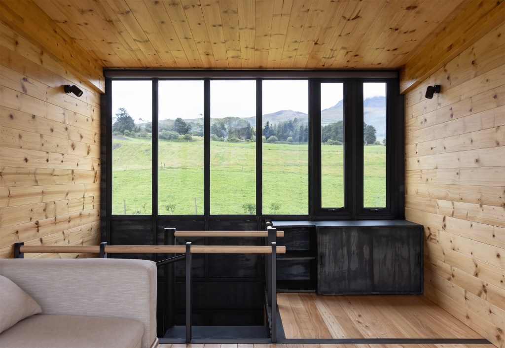 A couple primarily occupies the house, and they occasionally receive visits from family members. This is evident in the spatial organization of the house. The upper level has a wide view in all directions and contains spaces for the homeowners, as well as a small viewing loft that opens to the north and south. From there, the closest volcanoes can be seen. The lower level is smaller due to the slope and is used more when there are visitors. It can accommodate more people.