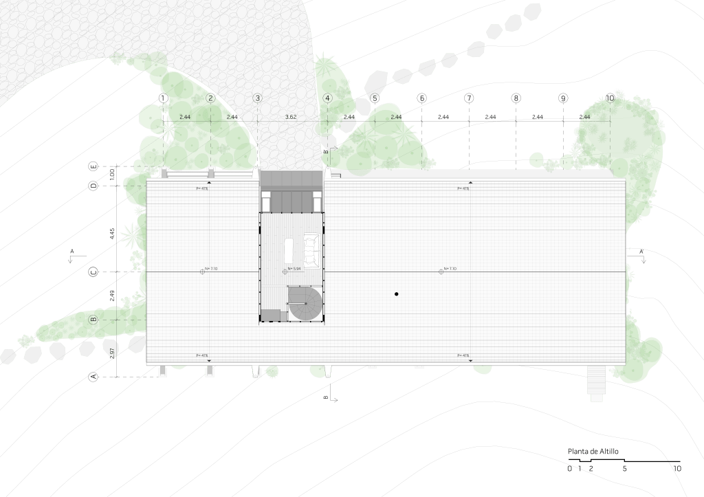 Since most of the house is on the upper floor, a ramp provides direct outdoor access, allowing you to walk around and enjoy the view. Located on one side of the house, this covered outdoor walkway creates a smooth transition between the interior and exterior. The house’s connection to the natural environment is also evident in its functionality. A set of solar panels provides electricity, and gray and black water is treated using grease traps, a biodigester, and a wetland. After passing through a small lagoon, the water is infiltrated to the ground.
