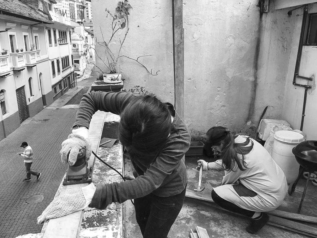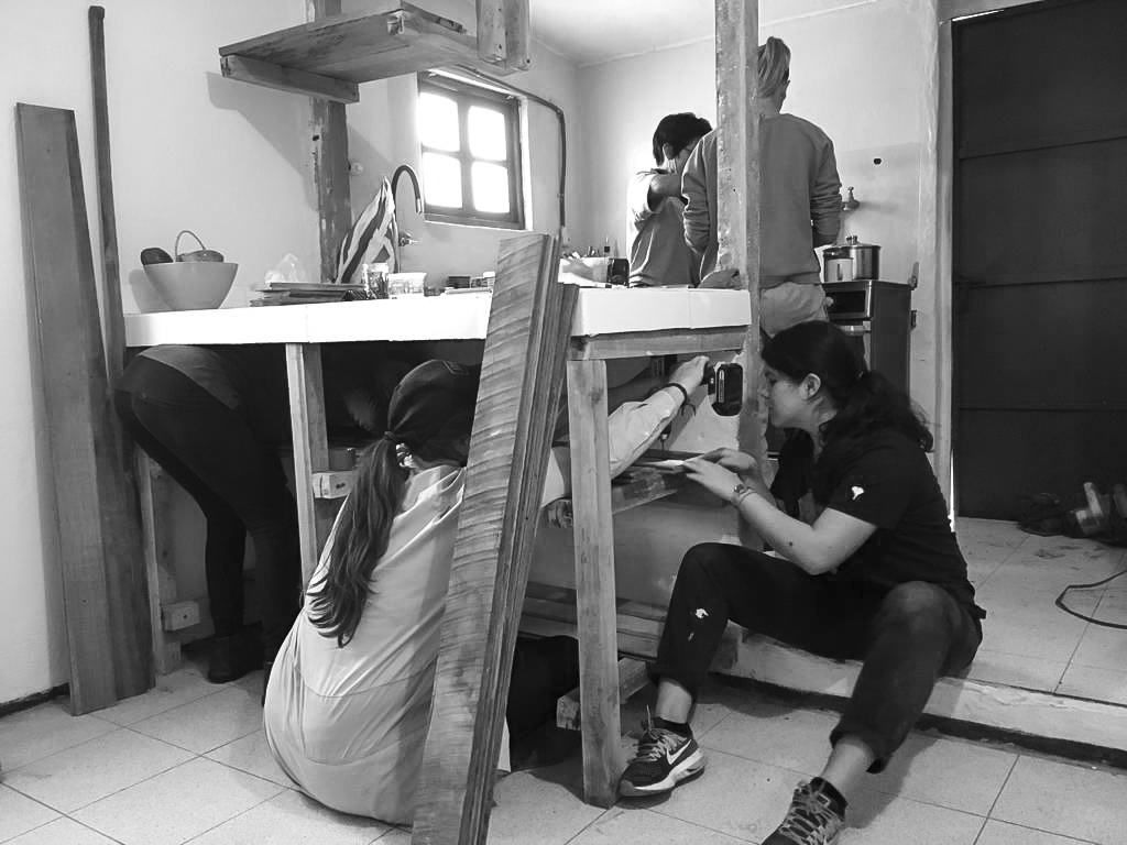 De allí en adelante, hemos realizado alrededor de diez encuentros en distintos proyectos, donde llevamos a cabo diversas actividades, como por ejemplo: cortar una pared con amoladora para luego remover con combo y picos el adobe; lijar, cortar y curar maderas para huellas de gradas; perforar y unir tubos metálicos; cortar y pegar vidrios o policarbonato; pintar paredes y techos; paliar escombros; armar muebles de madera; pintar con compresor planchas metálicas; montar muros divisorios, etc.